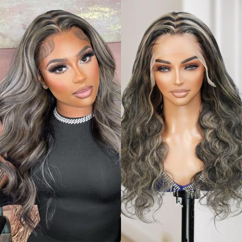 UpScale 100% Human Hair Glueless Pre Plucked 13x4 Lace Frontal Wig Silver Gray Highlight Body Wave 24" - 24" is backordered and will ship as soon as it is back in stock.